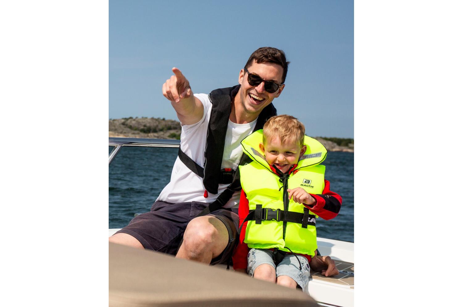 Reflectors, a whistle and crotch straps are included. There is a grab handle behind the collar. Size 3-15 kg has wider crotch straps and two attachment points for a better fit. The lifejacket has a buoyancy of 100 N and is classified as a lifejacket. A lifejacket saves lives. It is designed to always turn the wearer onto their back and keep their airway clear above the surface of the water, even if the wearer is unconscious or cannot swim. Life jackets are available with an inflatable lung or with solid floating material. What they all have in common is that when activated, most of the buoyancy is at the front and a sturdy collar supports the head. The life jacket is the obvious choice for people who cannot swim. Life jackets always have a load capacity of at least 100N. Inflatable models are divided into different categories depending on the conditions of use. An automatic life jacket inflates when the user is in the water, while a manual life jacket must be activated by the user.