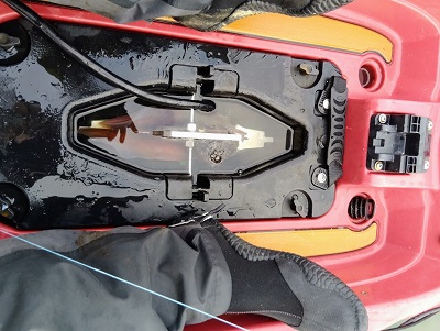 Sur l'eau, la trappe avant n'est pas accessible, évitez donc d'y mettre les choses dont vous aurez besoin en cours de session. Pour cela il y a la boite centrale, très pratique. Le siège dispose de 2 positions, la plus basse est la plus confortable et il reste un espace suffisant sous le siège pour y mettre des choses ou vos prises conservées.