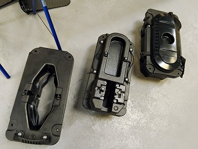 Le moteur STG en place et les différentes boites réceptrices selon l'option. La boite du haut est celle qui permet de boucher le puits et de repasser en propulsion pagaie