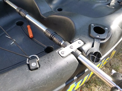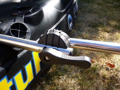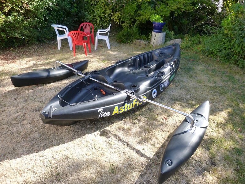 La hauteur sur l'eau des flotteurs est également réglable grâce à un système à cran, pour tenir compte de la ligne de flottaison du kayak en fonction du poids total mis dans le kayak, utilisateur, matériel de pêche, bivouac, etc, etc