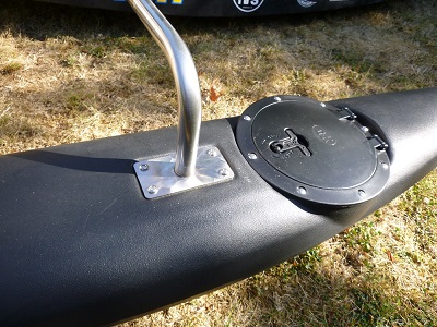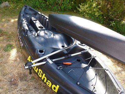l'ensemble est solidaire du kayak par des pattes de maintien qui se vissent dans les inserts des taquets arrières