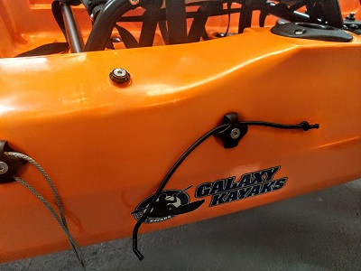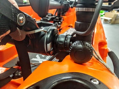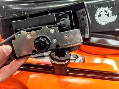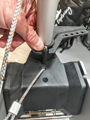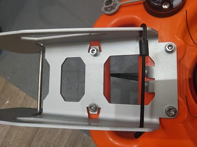 Sur ce modèle, le gouvernail étant sous le kayak, on l'a laissé en place, dans ce cas il est nécessaire de bloquer le moteur en position dans l'axe car il ne servira qu'à la propulsion, le changement de direction se faisant à l'aide du safran d'origine. cela facilitera également le passage de la propulsion électrique, à la propulsion pédale, le safran d'origine étant toujours opérationnel. Le système d'origine étant plus délicat à régler qu'un safran extérieur, je pense que c'est la solution la plus facile et efficace. Pour le blocage dans l'axe de l'arbre moteur on glisse une goupille dans l'emplacement prévu pour cela