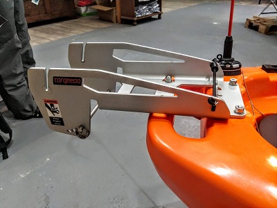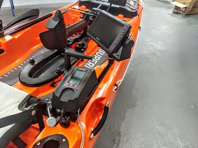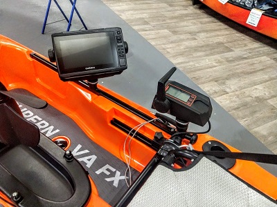 Une version avec écran de sondeur grâce à un railmount Railblaza ( non fourni) monté sur le montant du siège, ceci pour permettre le gain de place nécessaire à la mise en place de l'écran à la bonne distance. Comme pour le montage sur le FX2, tout est monté du même bord, ceci pour laisser le bord opposé libre en cas de besoin de remonter dans le flotteur après un dessalage intempestif....