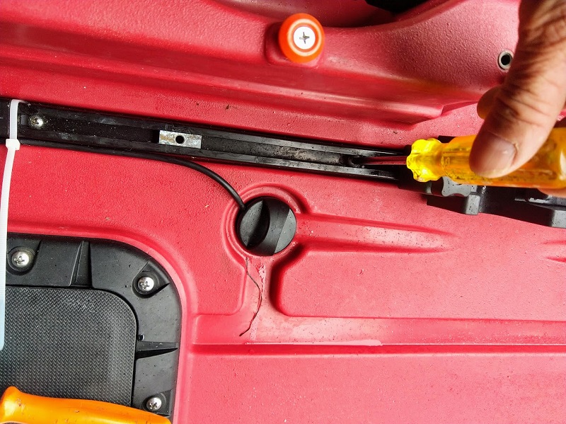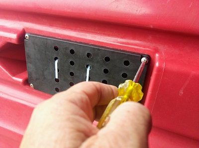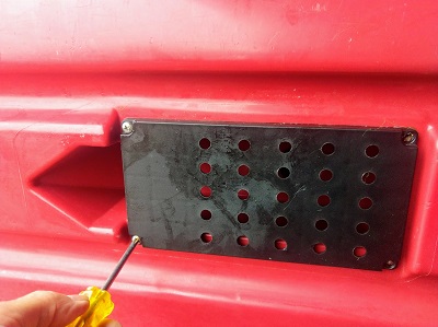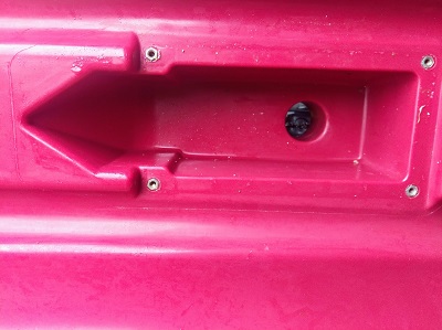 Avant cela, on commence par retourner le kayak et démonter la plaque de protection de la sonde, il n'y a pas d'inserts dans ce puits de sonde