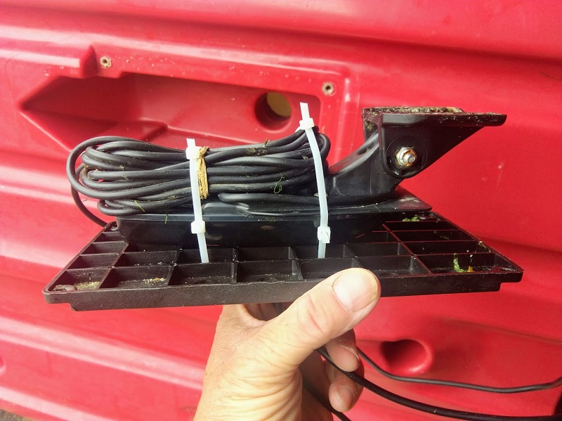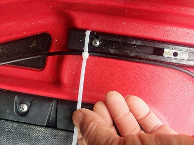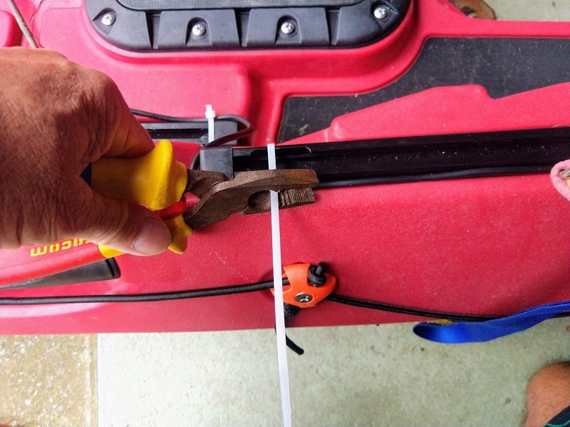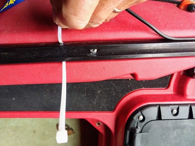 Pour faire courir le câble sonde le long de la coque, je me suis servi des rails de siège et d'accessoires. Il faut dévisser légèrement les vis qui tiennent les rails pour pouvoir les lever légèrement pour passer les colliers rilsan de maintien. J'en ai mis un sur le bout du rail du siège