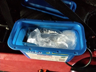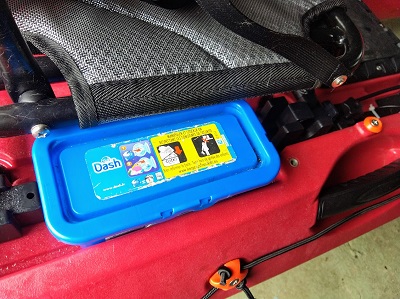 Comme cette batterie me sert pour plusieurs flotteurs, le l'ai mise dans une petite boite étanche faite moi-même ( récupération d'une petite boite de lessive). La boite est posée sur le côté du siège, elle est donc facilement amovible.