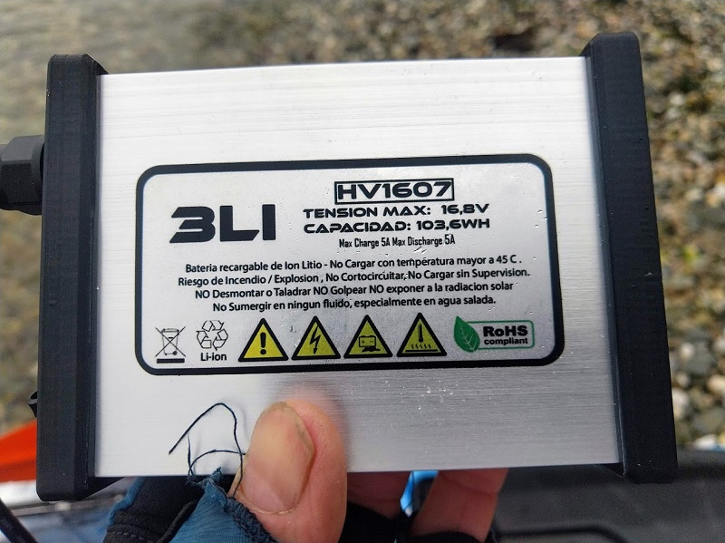 Pour l'alimentation du sondeur, j'ai utilisé une batterie lithium, nouvellement arrivée sur le site, une HV 1607 de chez 3LI, la nouvelle marque espagnole distribuée par Galaxykayaks France, avec son câble GARMIN monté dessus.