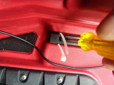 Pour fixer la sonde on vient la positionner, avec le surplus de câble correctement lové, sur le capot et on la fixe à l'aide de colliers rilsan