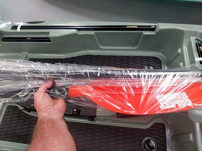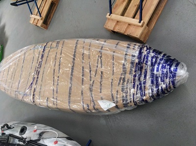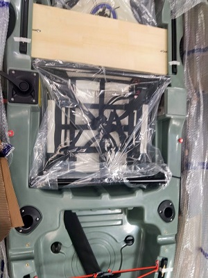 On commence par enlever la plaque en bois de renfort de transport, retirer aussi la pagaie du fond du kayak
