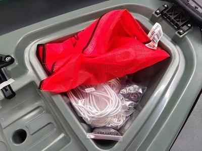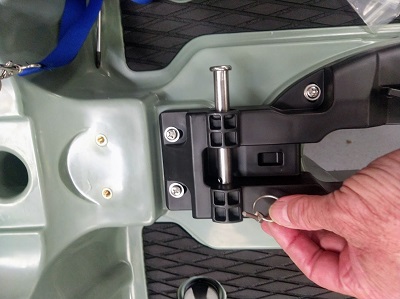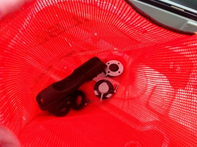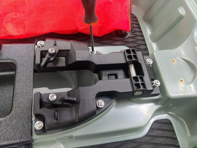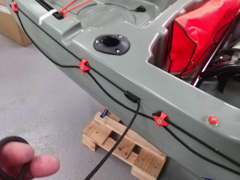Dans la trappe avant vous allez trouver, les jeux de lignes de vie de rechange ainsi que du dacron de rechange pour la commande safran, le sac RAILBLAZA avec les accessoires à l'intérieur,( 2 receveurs et 1 porte canne avec la visserie), les fixations de siège.