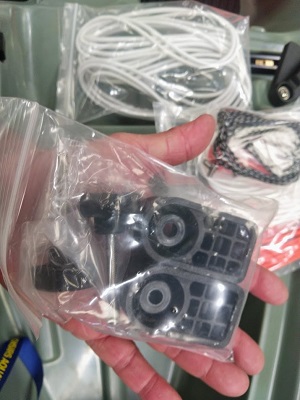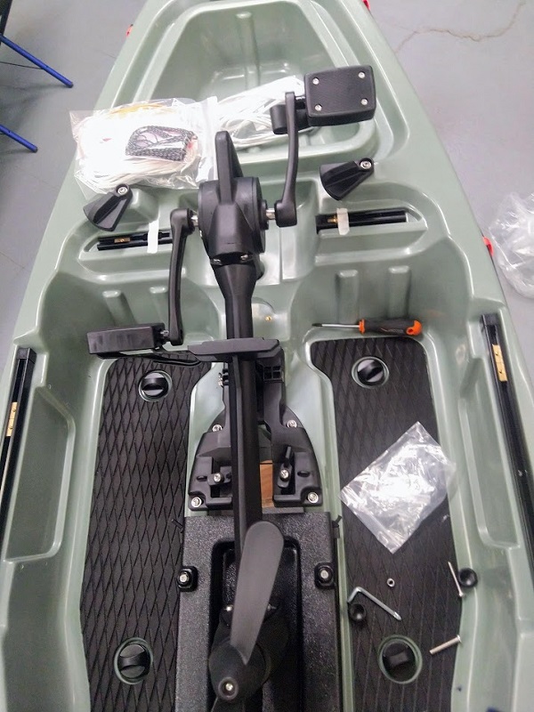 Dans le carton du pédalier vous allez trouver, le corps de pédalier, les pédales droite et gauche (repérées) montées sur leurs bras, la visserie, des clefs Allen, un petit sachet de joints de rechange et la pièce porteuse du pédalier a fixer sur le kayak