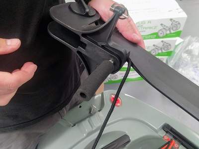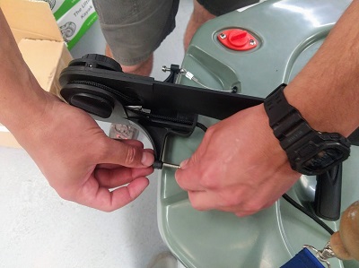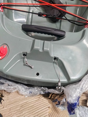 Passez au montage du gouvernail, commencez par retirer la protection mousse de l'axe, glissez l'axe du safran dans son logement, mettre la goupille de blocage, mettre les câbles de commande. Le réglage est fait en usine, vous avez juste à mettre les vis.