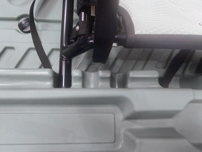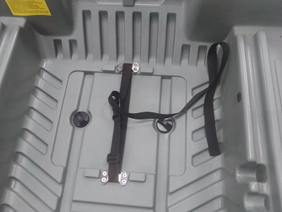 On distingue la forme de l'arrière avec les différents inserts et un emplacement batterie derrière le siège avec les sangles de maintien