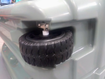 Allons voir dessous... Une forme de coque qui le rend très stable avec un puits de sonde et son capot de protection et les roues de déplacement déjà montées, il y a aussi dessous une poignée moulée à l'avant