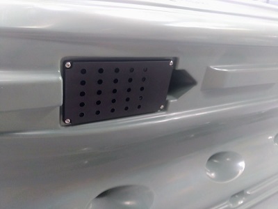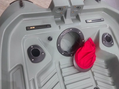 On voit aussi les poignées de portage et au dessus des taquets d'amarrage ainsi que le bouchon de vidange de la double coque