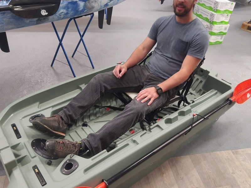 Il est prévu pour des utilisateurs de 1.40m à 2.05m, Baptiste qui fait 1.82m donne une bonne vision de l'espace pêche