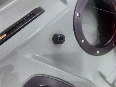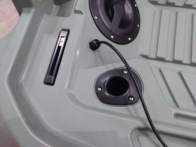 2 porte cannes fixes de chaque côté ainsi qu'un presse étoupe de câble d'alimentation sondeur déjà installé