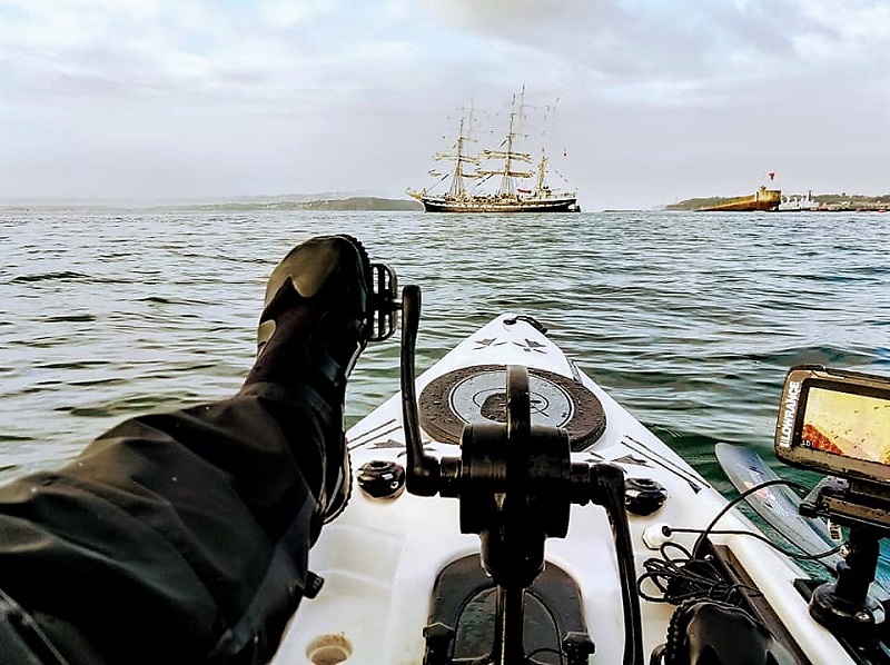 La pagaie Manta Ray Carbon au premier plan, bien que ce kayak soit à propulsion pédalier, de par la législation il est obligatoire de prendre une pagaie