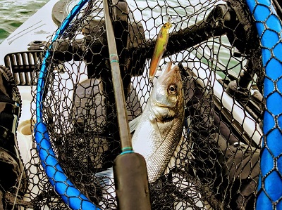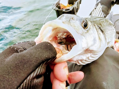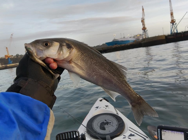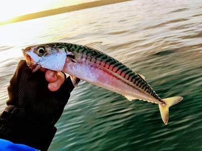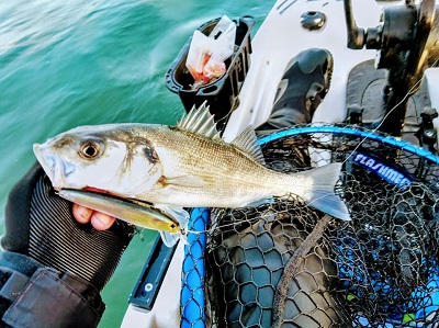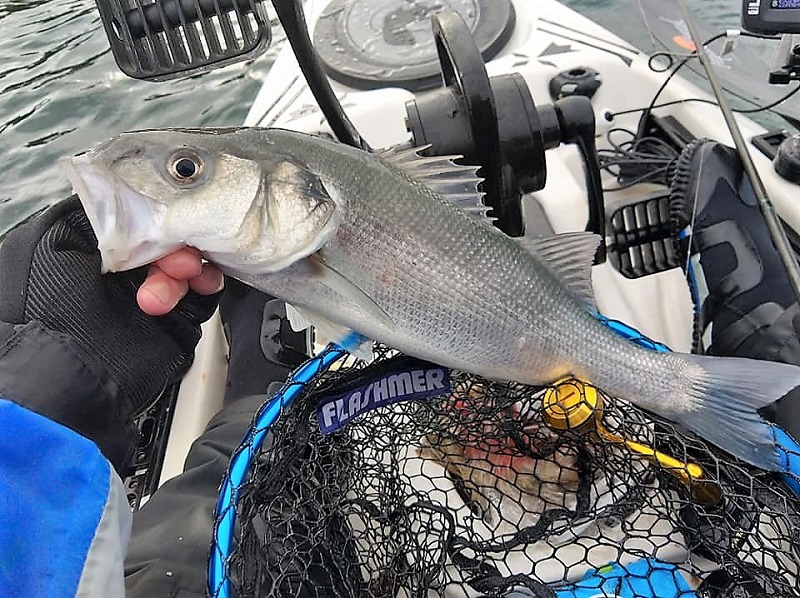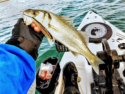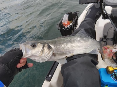 La boule de fourrage est passée, je remonte mon PN de traîne et après quelques longueurs ce seront 2 maquereaux coup sur coup qui viendront au kayak ainsi qu'un bar qui devait les accompagner