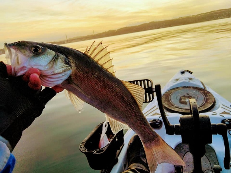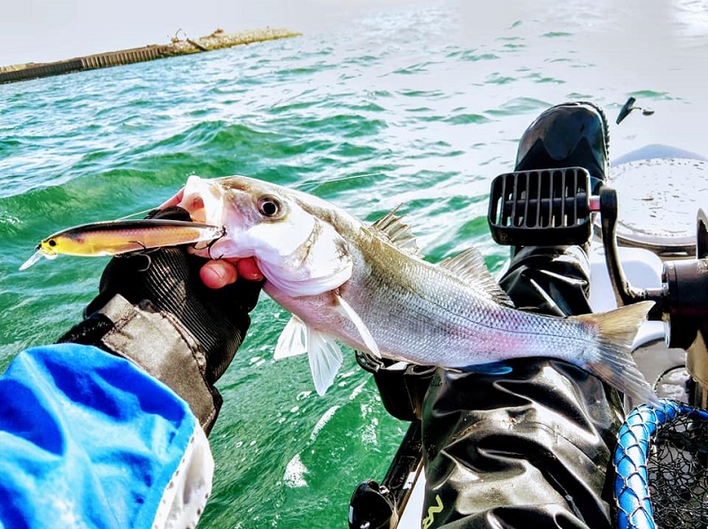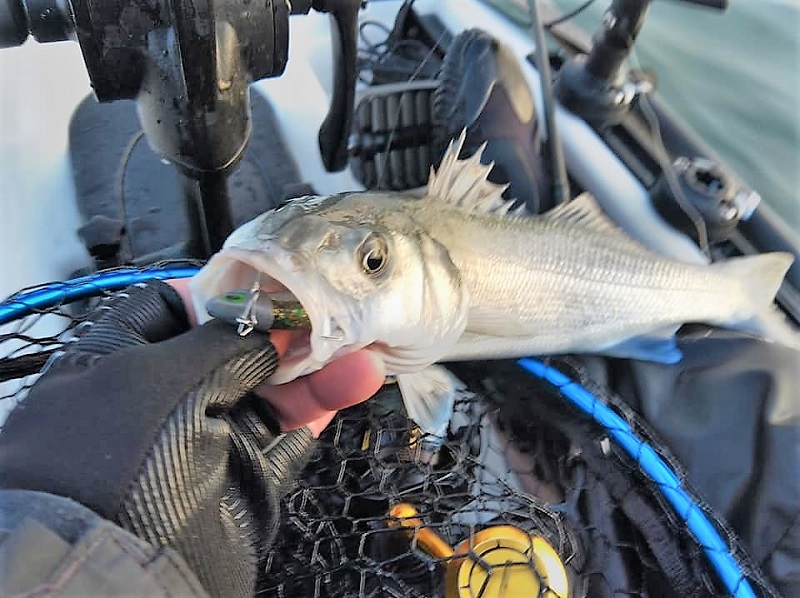 Dès la mise à l'eau et après quelques tours de pédalier, premier poisson pris dans 3 mètres d'eau avec un PN yo zuri 3DR minnow 100 SP, c'est le PN qui sort du lot en ce moment, sur tous ceux que je mets à l'eau, je le mets juste devant le mega flash rose qui marche bien aussi en rade