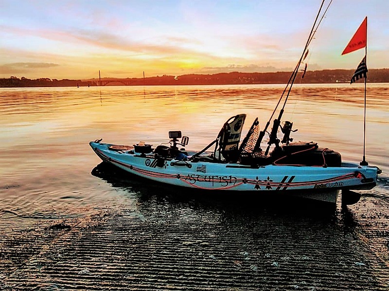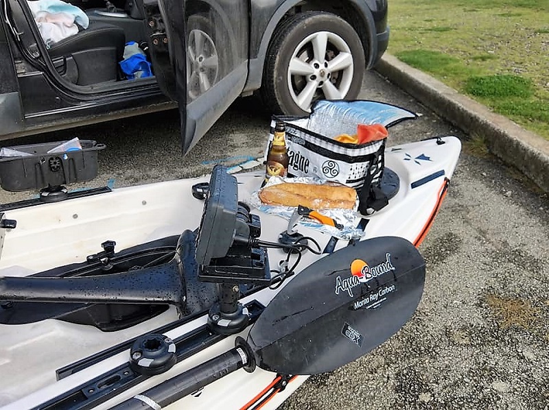 Le kayak est équipé d'accessoires Railblaza, stowpod, porte cannes, pagaie carbone aqua Bound, sondeur Lowrance hook2, coffre de rangement Galaxy. Le chariot est un C-Tug standard qui trouve sa place dans le coffre avant avec la batterie d'alimentation du sondeur