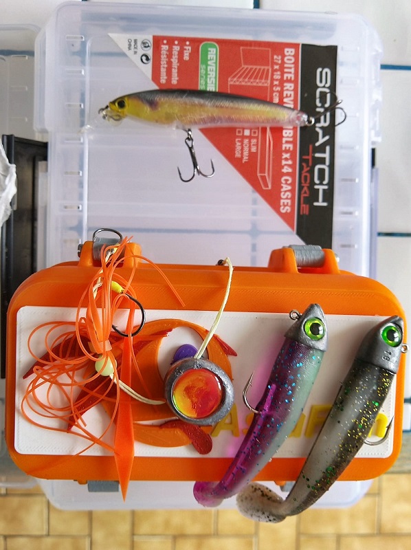 Les leurres qui ont fonctionné ce matin, la petite boite de rangement est un cadeau d'un GK réalisé avec une imprimante 3D, pas mal non ??